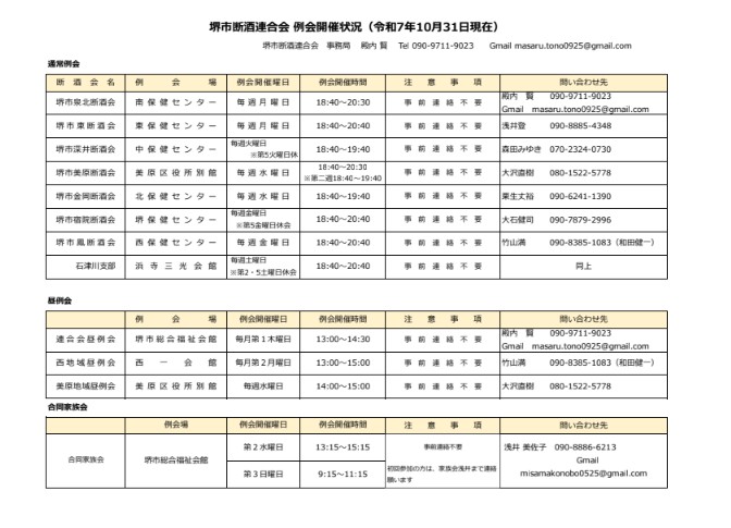 ◎堺市宿院断酒会・堺市深井断酒会は、第5週と祝日は「休会」です。また、堺市宿院断酒会・堺市美原断酒会は、「第2週は前半のみ(後半弊会連絡会)」です。ご了承下さい。