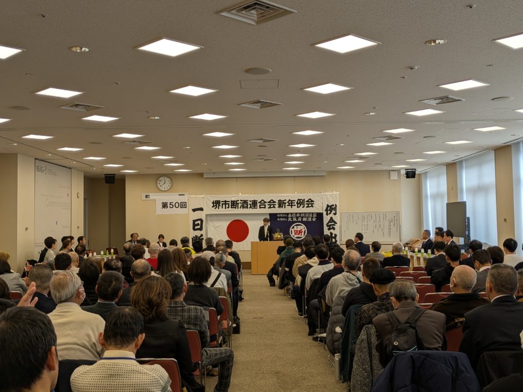 令和8年1月元日 第50回堺市断酒連合会新年例会互礼会を、今年も堺市泉ヶ丘の国際障がい者交流センター(ビッグアイ)にて開催した。堺市行政、各議会議員、医療、作業所から12名のご来賓をお招きし、堺市断酒連合会並びに朋友の会員家族、行政・医療・作業所関係者など、去年同様、合計約180名もの多数の参加を頂いた。令和8年も元日から酒害者本人、ご家族の熱のこもった素晴らしい体験談を数多く聴かせて頂き、今年一年の断酒継続の決意を新たにした。「堺市新年互礼会に参加すると今年一年お酒が止められる」(堺市断酒連合会 会長 大石健司)