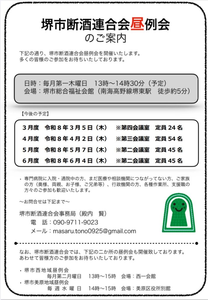 ◎堺市断酒連合会昼例会について:会場都合のため、入室が例会開始の10分前になります。それまではエレベーター前フロアでお待ち下さい。